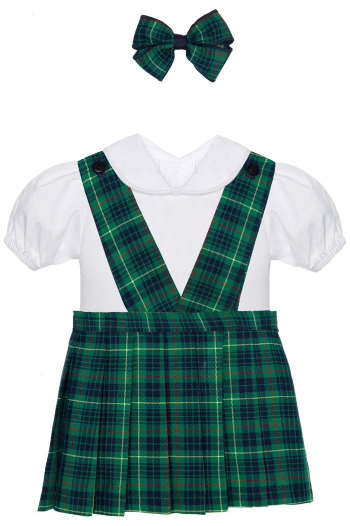 - Jumper with blouse and matching bow fits dolls or stuffed animals