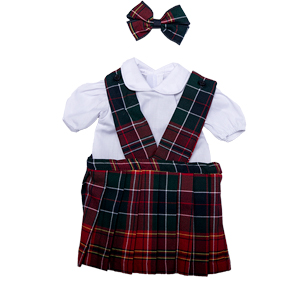 - Jumper with blouse and matching bow fits dolls or stuffed animals