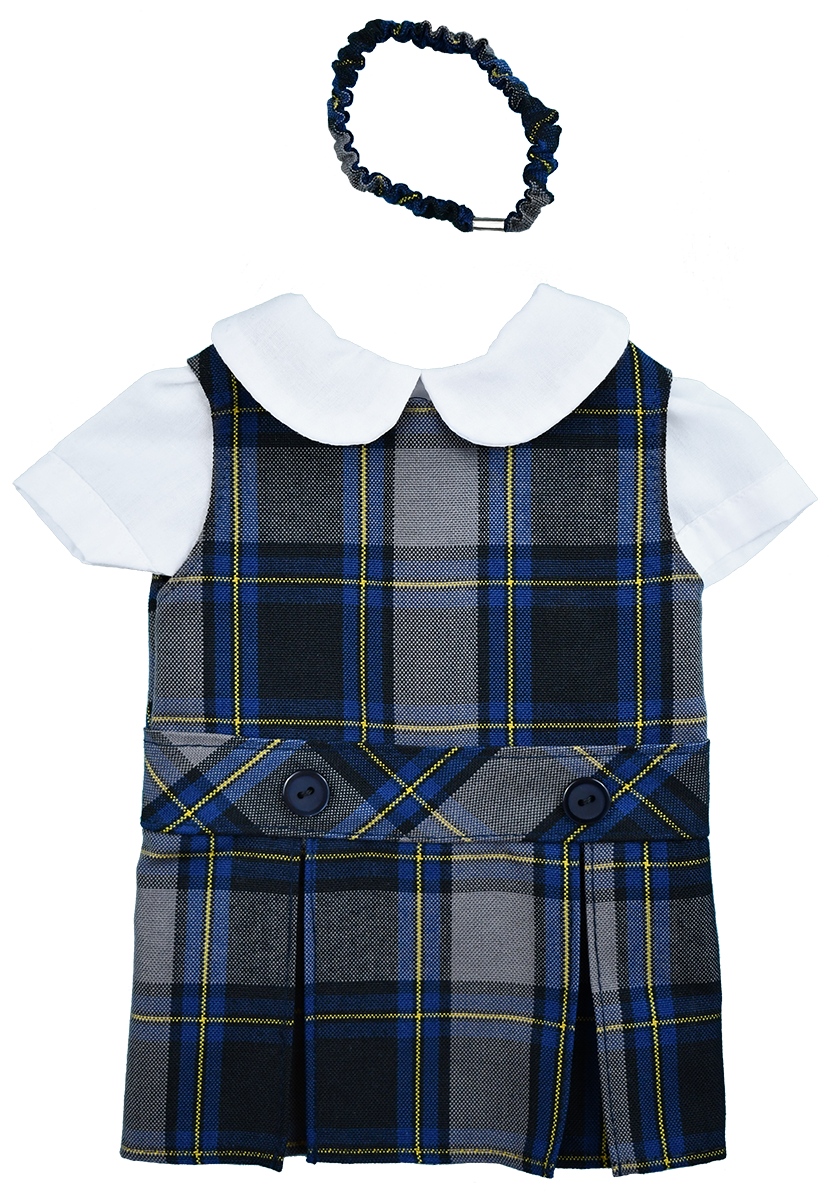- Jumper with blouse and matching bow fits dolls or stuffed animals