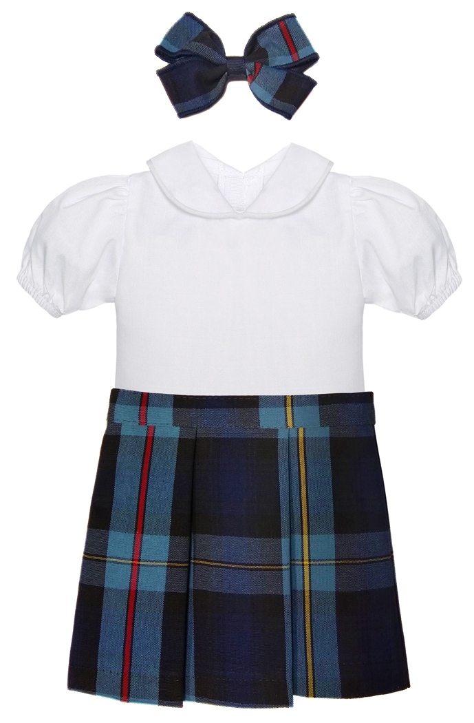- Plaid skirt and blouse with matching bow fits dolls or stuffed animals