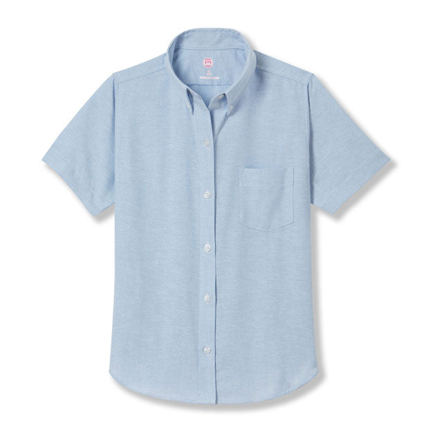 This short sleeve feminine fit oxford offers a dress collar and two-ply edge stitched yoke. Features include a high thread count cotton / polyester fabric for modesty, tapered back princess darts and a lined and fused placket and collar for stability.