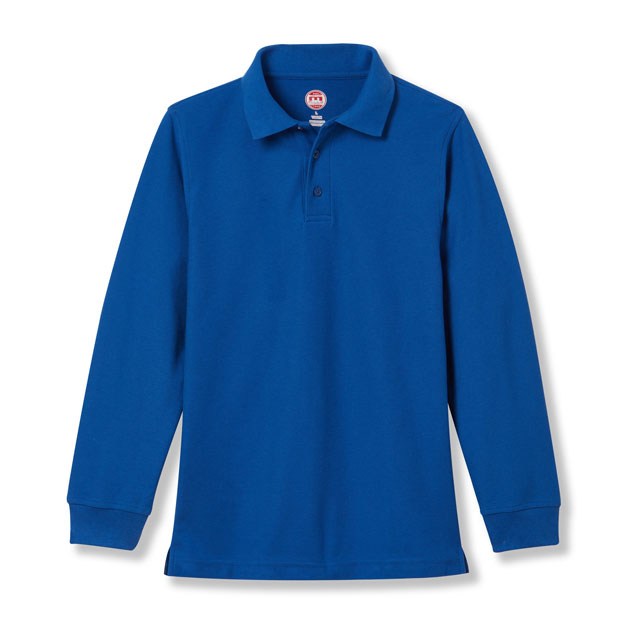 Our classic fit long sleeve cotton/polyester blend polo shirt is cut for a roomy silhouette. The pique polo shirt is sold to both boys and girls. This boxy style polo is built to be durable with reinforced shoulders, securely stitched buttons and a curl-free rib-knit collar. Girls should buy one size smaller for a more trim fit.