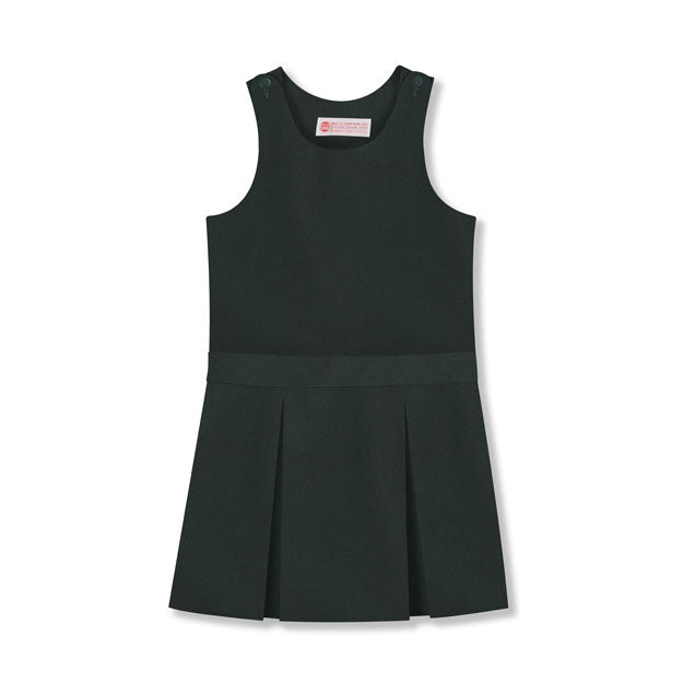 This scoop neck jumper with a shoulder button closure features a full decorative band with bias pattern and front and back inverted pleats.
