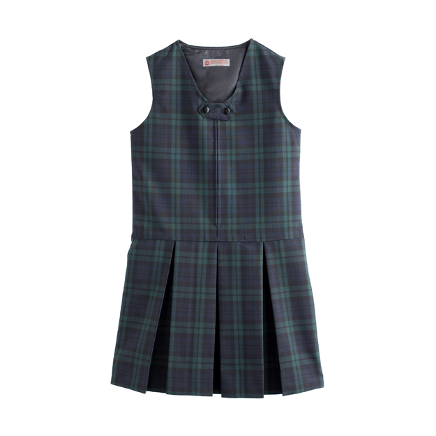 Our front zip jumper is an easy, dress-yourself style. A long zipper allows for step-in or pullover dressing. Features a drop waist, relaxed fit, and inverted box pleats. Decorative tab detail can be used with or without a tie.