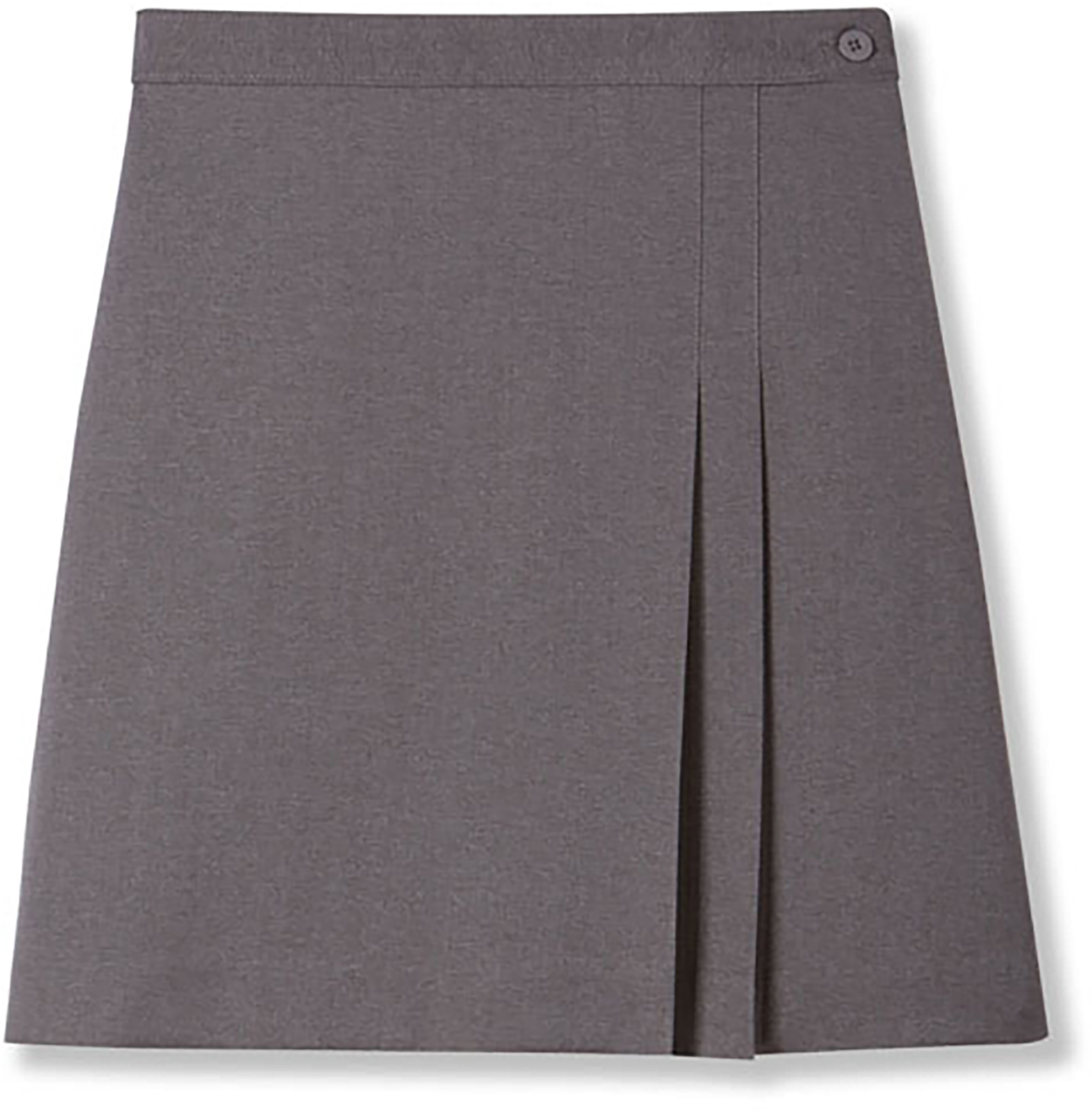 Our modern A-line styled skirt features two stitched-down front pleats, a left side button, a zipper closure and an interior covered back elastic for easy fit.