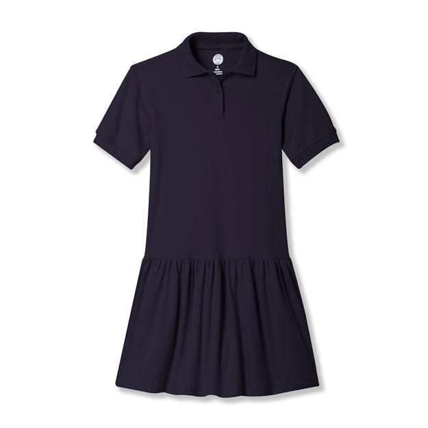 Our short sleeve cotton / polyester knit collar tennis dress features a drop waist styling with topstitched seams a coverstitched hem and a two-button placket with matching buttons and rib cuffs.