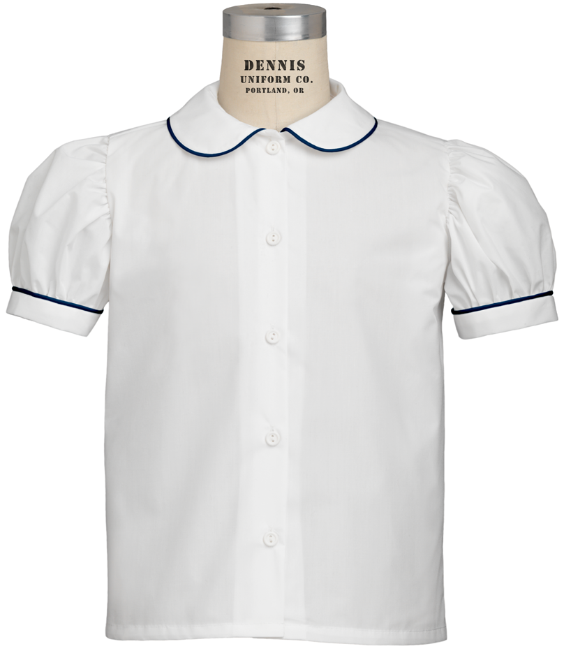 Our Navy Piping Peter Pan Collar Blouse is stylish and fun. With a rounded collar shape that's perfect for Middy ties and a comfortable, easy-to-care-for broadcloth fabric, this blouse is a great uniform choice.